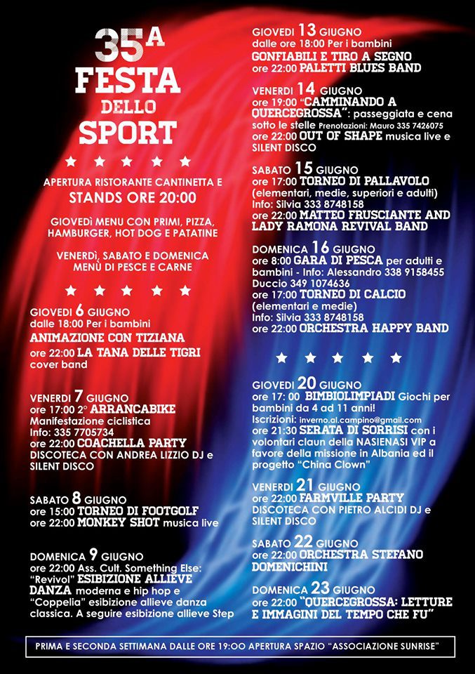 Dal 6 al 23 giugno 2019, presso gli impianti sportivi di Quercegrossa torna a Monteriggioni (Siena) l’atteso appuntamento con la Festa dello Sport, giunta quest’anno alla 35° edizione. Musica, intrattenimento per bambini, ristorante e cantinetta faranno da cornice ai numerosi tornei e manifestazioni sportive dedicate a calcio, pallavolo, ciclismo, pesca e molto altro.