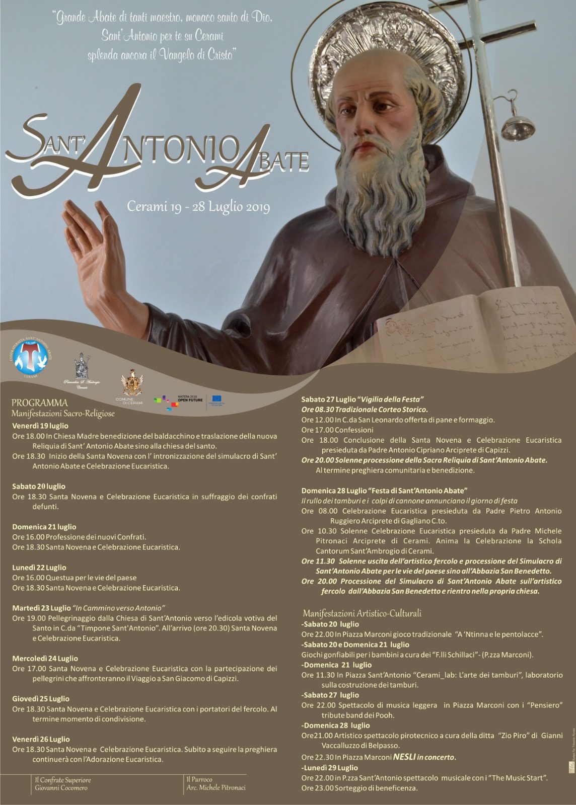 L’ultima domenica di luglio a Cerami (Enna) si svolge la solenne Festa in onore di Sant’Antonio Abate in cui il fercolo con il simulacro del Santo percorre le vie del paese preceduto dalle confraternite di Sant’Antonio Abate, Madonna del Carmelo, San Sebastiano e San Michele Arcangelo. In occasione dei festeggiamenti nelle giornate del 27 e 28 luglio 2019 un ricco programma di eventi religiosi e spettacoli animerà il piccolo borgo siciliano: si va dai cortei storici alle offerte di pane e formaggio ai concerti di musica leggera in piazza Marconi. Qui sabato 27 luglio si esibiranno i Pensiero, storica tribute band dei Pooh mentre sabato 29 luglio a calcare il palco sarà Nesli, pseudonimo di Francesco Tarducci, cantautore, rapper e produttore discografico italiano, fratello minore del rapper Fabri Fibra. Il tour 2019 dell’ artista prende il nome di “VENGO IN PACE“, titolo del suo ultimo album. Come da tradizione non mancheranno i suggestivi fuochi pirotecnici con l’inno come sottofondo.