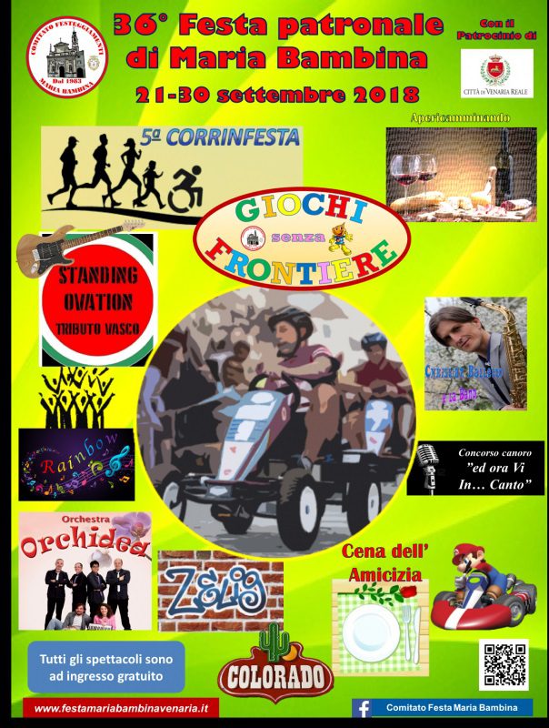 Eventi musicali con concerti e serate danzanti, quest’anno grande novità il 29 settembre con serata cabaret con ospiti da Zelig e Colorado. stand gastronomico e appuntamento domenica 23 alle 12 con Apericamminando percorso enogastronomici per i luoghi della parrocchia. il 29 sera cena dell’amicizia. Per Apericamminando e Cena è richiesta la prenotazione (vedere numeri su sito internet alla pagina eventi). In piazza Annunziata grandi eventi il 22 settembre dalle 16 manifestazione podistica non competitiva Corrinfesta e Insiemeinfesta (dedicata ai disabili) con percorsi dentro la Reggia di Venaria Reale e pastaparty finale in oratorio. Il 23 settembre giochi Senza Frontiere alle 16,30. Il 29 settembre dalle 15 Mini Palio dei Borghi gara di kart a Pedali dedicata ai bambini tra 8 e 13 anni. Il 30 settembre Palio dei 12 Borghi Venariesi a bordo di kart a Pedali su un tracciato ricavato in piazza Annunziata la gara è dedicata a ragazzi e adulti dai 14 ai 99 anni. al mattino le prove cronometrate dalle 10 e al pomeriggio la gara dalle 14,30. La festa ha i suoi momenti religiosi dedicati a Maria Bambina il 24,25,26 settembre triduo religioso in chiesa dalle 20,30 e il 30 settembre alle ore 18 Santa Messa sul sagrato della Chiesa seguito dalla Solenne Processione della Statua di Maria Bambina. Tutto il ricavato della festa viene devoluto al Parrocco per i bisogni della comunità di Santa Maria.