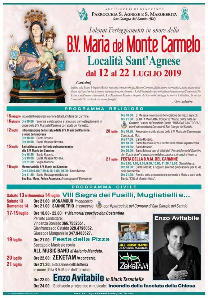 Dal 12 al 21 luglio 2019 in località Sant’Agnese si svolgeranno a San Giorgio del Sannio (Benevento) i solenni festeggiamenti in onore della B.V. Maria del Monte Carmelo. La manifestazione prevede come da tradizione un ricco calendario di appuntamenti sportivi, culturali e gastronomici fra cui la Sagra dei Fusilli, Mugliatielli e… (13 e 14 luglio), il 1° Memorial Sportivo Don Costantino (17-19 luglio) e la Festa della Pizza con performance della All Music Band di Antonio Mandato. Non mancherà la grande musica live con i concerti del gruppo Monamour (13 e 14 luglio) ed Enzo Avitabile in Black Tarantella (21 luglio). Chiuderà i festeggiamenti il maestoso spettacolo pirotecnico e musicale con l’incendio notturno della facciata della Chiesa (21 luglio).
