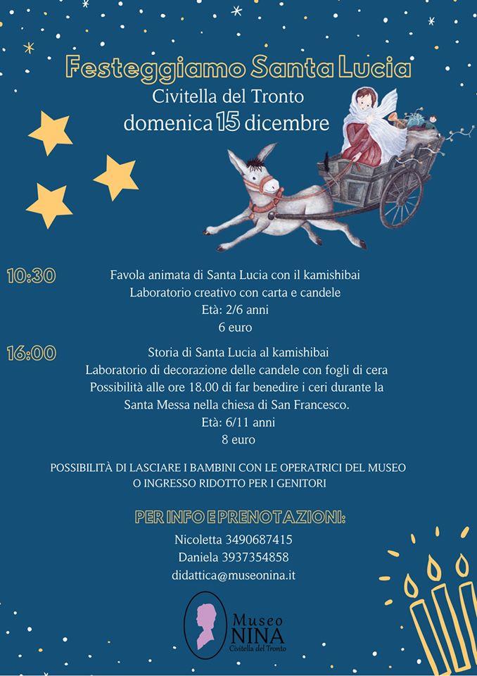 Domenica 15 dicembre 2019 il Museo NINA di Civitella del Tronto (Teramo) ospiterà Festeggiamo Santa Lucia, interessante ciclo di laboratori creativi per bambini di età compresa fra i 2 e gli 11 anni. L’evento vedrà andare in scena la favola animata di Santa Lucia con il kamishiba e il laboratorio creativo con carta e candele alle ore 10:30 seguito alle 16:00 dal laboratorio di decorazione delle candele con fogli di cera e possibilità alle ore 18:00 di far benedire i ceri durante la Santa Messa nella Chiesa di San Francesco.