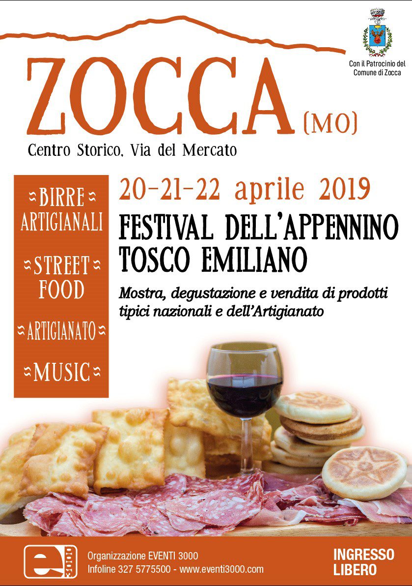 L’agenzia Eventi 3000, società che vanta una consolidata esperienza in ambito di organizzazione di eventi volti alla promozione e valorizzazione del territorio, organizza nel centro storico di Zocca (Modena), città natale del famoso rocker Vasco Rossi, il Festival dell’Appennino Tosco Emiliano con mostra, degustazione e vendita di prodotti tipici nazionali e dell’artigianato. L’evento si svolgerà nei giorni 20, 21 e 22 aprile 2019 in piazza del Mercato e vuole essere una vetrina delle eccellenze del made in Italy. Lo scopo della kermesse è quello di attrarre migliaia di visitatori che potranno degustare ed acquistare prodotti unici ed evocativi e creare un connubio perfetto tra il buon cibo e ottimi vini e birre. Gli artigiani saranno gli attori della manifestazione in sinergia con gli antichi mestieri che mostreranno in diretta le loro creazioni e manufatti.