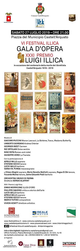 In occasione del centenario della morte di Luigi Illica, celebre librettista e drammaturgo originario di Castell’Arquato che collaborò con i più illustri musicisti del suo tempo quali Giacomo Puccini e Pietro Mascagni, nella giornata di sabato 27 luglio 2019 è in programma un Gala d’Opera nella prestigiosa piazza Monumentale del borgo medioevale di Castell’Arquato (Piacenza). Protagonisti il celebre tenore Francesco Meli e il talentuoso soprano Benedetta Torre. Ad accompagnarli l’Orchestra Filarmonica Italiana: sul podio Matteo Pais, giovane direttore esperto del repertorio operistico che lavora regolarmente a Salisburgo, Vienna, Firenze e Toronto. Il programma del Galà renderà omaggio agli amatissimi personaggi usciti dalla penna di Luigi Illica come Mimì o Cavaradossi, oltre a sinfonie d’opera dei grandi compositori italiani. Nel corso della serata, presentata da Sabino Lenoci (critico musicale e direttore della rivista L’Opera), verrà consegnato il XXXI Premio Internazionale Luigi Illica, prestigioso riconoscimento istituito nel 1961. Tra i grandi nomi premiati nelle passate edizioni, Franco Zeffirelli, Riccardo Muti, Luciano Pavarotti, Plácido Domingo e recentemente Leo Nucci.