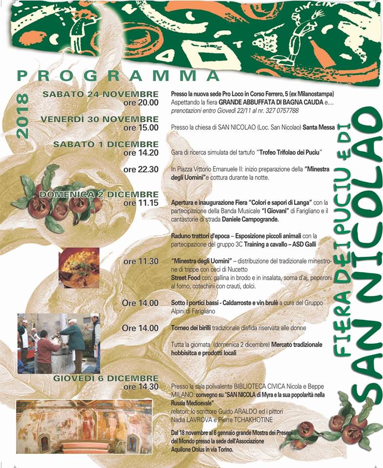 La sagra, dedicata ad uno dei più tipici frutti autunnali – la nespola (puciu) – si svolge in concomitanza con la festa patronale di San Nicolao. Tra gli altri appuntamenti da non perdere: il gran mercatone della Fiera dei Puciu, la rassegna “Colori e Sapori di Langa”, salotto di degustazione dei prodotti locali (aperto dalle 9:00 alle 18:00) e la distribuzione del delizioso Minestrone di Trippe e Ceci (denominato “Minestra degli Uomini” e cotto per tutta la notte). Presso la Sala Polivalente “Biblioteca Civica” si terranno eventi culturali.
