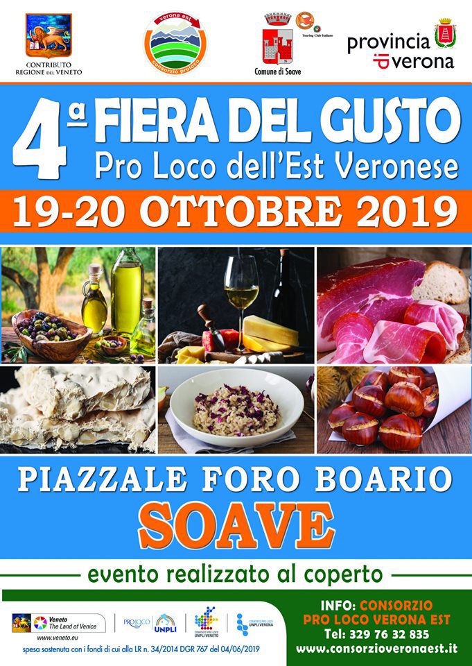 Sabato 19 e domenica 20 ottobre 2019 si terrà a Soave (Verona) la 4° Fiera del Gusto dell’Est Veronese, due giornate dedicate all’esposizione e degustazione dei prodotti del territorio attraverso l’assaggio di piatti tipici locali realizzati dalle numerose Pro Loco coinvolte.