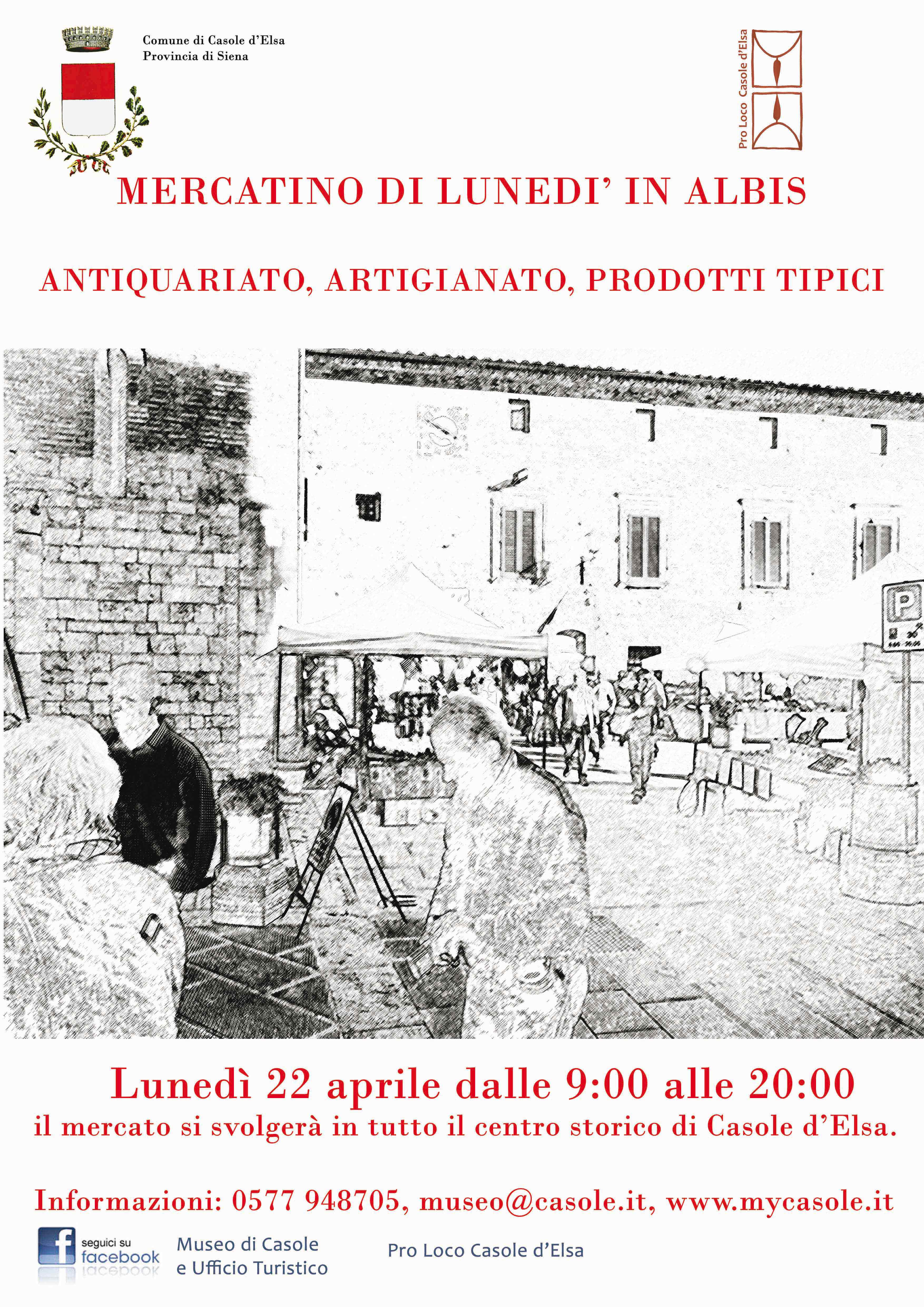 Lunedì 22 Aprile 2019 si svolgerà la Fiera del Lunedì In Albis a Casole d’Elsa (Siena) che prevederà il consueto mercatino di Pasquetta nel centro storico della cittadina Valdelsana. Dalle ore 9:00 alle ore 19:00 troverete un’ottima varietà di prodotti tipici e articoli di artigianato con espositori provenienti da tutta la Toscana.