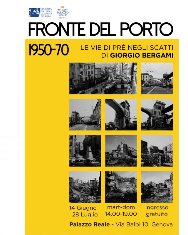 Palazzo Reale di Genova, dal 14 giugno al 28 luglio 2019, ospita nelle Sale della Corte una mostra dedicata alle fotografie di Giorgio Bergami e, in particolare, ad alcuni scatti realizzati tra gli anni Cinquanta e Settanta incentrati sulla zona portuale e sul quartiere di Prè. Lo stile di Bergami è testimoniale e fattuale, in grado di restituire in modo immediato l’impatto delle immagini, autore di reportage metropolitani per raccontare Genova e la sua storia durante tutta la seconda metà del Novecento.