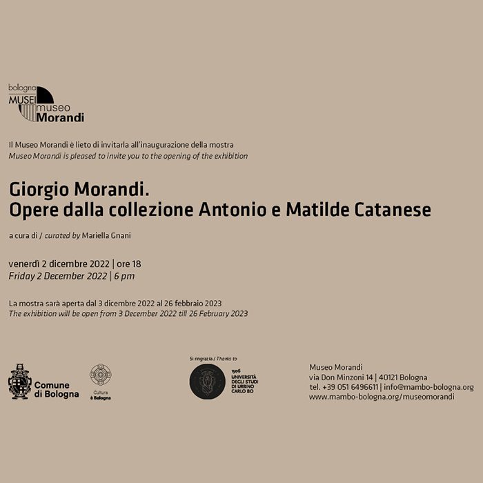 Il Museo Morandi è lieto di ospitare e rendere fruibile al pubblico un importante nucleo di lavori di Giorgio Morandi provenienti dalla collezione privata di Antonio e Matilde Catanese. La mostra Giorgio Morandi – Opere dalla collezione Antonio e Matilde Catanese presenta 27 opere appartenenti a una raccolta nata dalla passione dei coniugi Catanese, che iniziano ad acquistare fin dagli anni Sessanta i primi Morandi, dando prova del loro gusto raffinato e lungimirante in una città come Milano, che nel Novecento ebbe un ruolo fondamentale nel mondo dell’arte e del collezionismo in particolare.