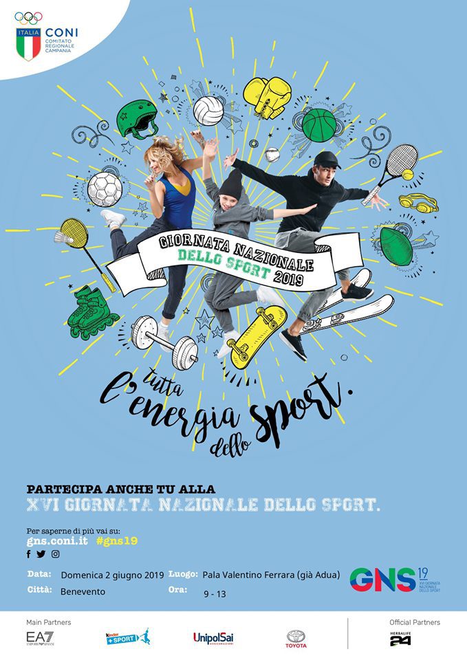Domenica 2 giugno 2019 il Pala Valentino Ferrara di Benevento ospiterà la Giornata Nazionale dello Sport che, istituita dalla Presidenza del Consiglio dei Ministri, si svolgerà in contemporanea in tutte le province italiane. Quest’anno la giornata sarà incentrata sul tema “Tutta l’energia dello sport” e si svolgerà dalle 9:00 alle 13:00 in via Adua dove si terrà una vetrina di tutti gli sport ospitabili, in particolare tiro con l’arco, scherma, badminton, atletica, tennis, scacchi, calcetto, pallavolo, basket, tiro a segno e ciclismo. La manifestazione inizierà con la sfilata delle bandiere e dei partecipanti a cui seguiranno le esibizioni dei vari gruppi sportivi; infine saranno premiate società sportive ed atleti che si sono distinte/i nelle varie discipline sportive.