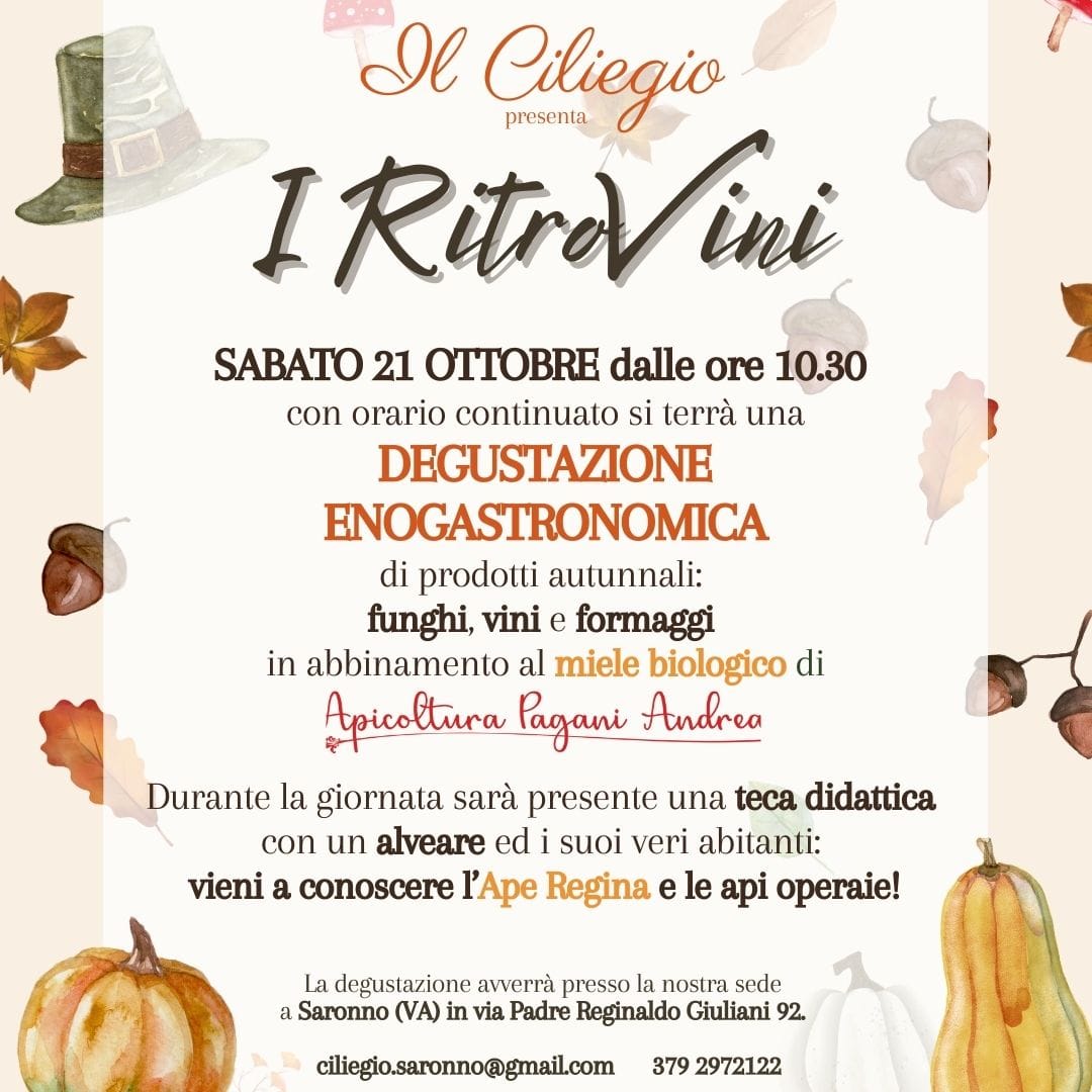 L’attesissmo evento I RitroVini di Saronno propone una deliziosa degustazione enogastronomica di prodotti autunnali: funghi, vini, formaggi in abbinamento al miele biologico e tantissime altre prelibatezze tutte da scoprire!