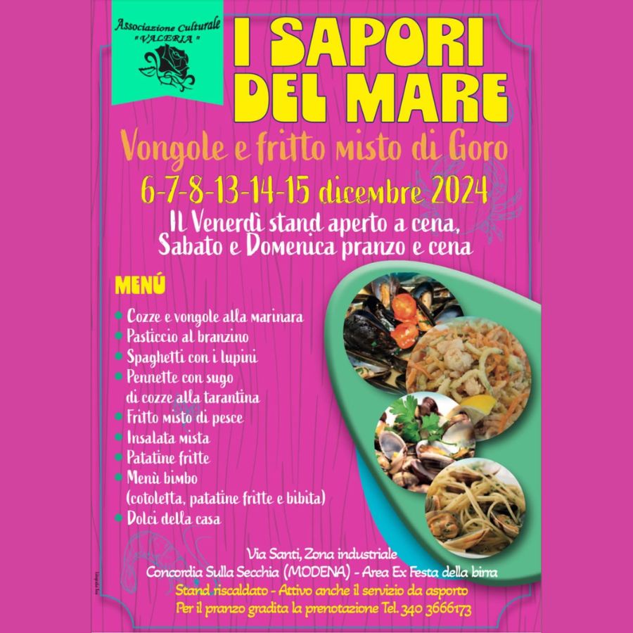 A CONCORDIA SULLA SECCHIA in provincia di Modena vi aspettiamo per la prima edizione di “I SAPORI DEL MARE” occasione in cui potrete assaggiare vongole e cozze di Goro, il nostro ormai famoso fritto misto e altri piatti a base di pesce.