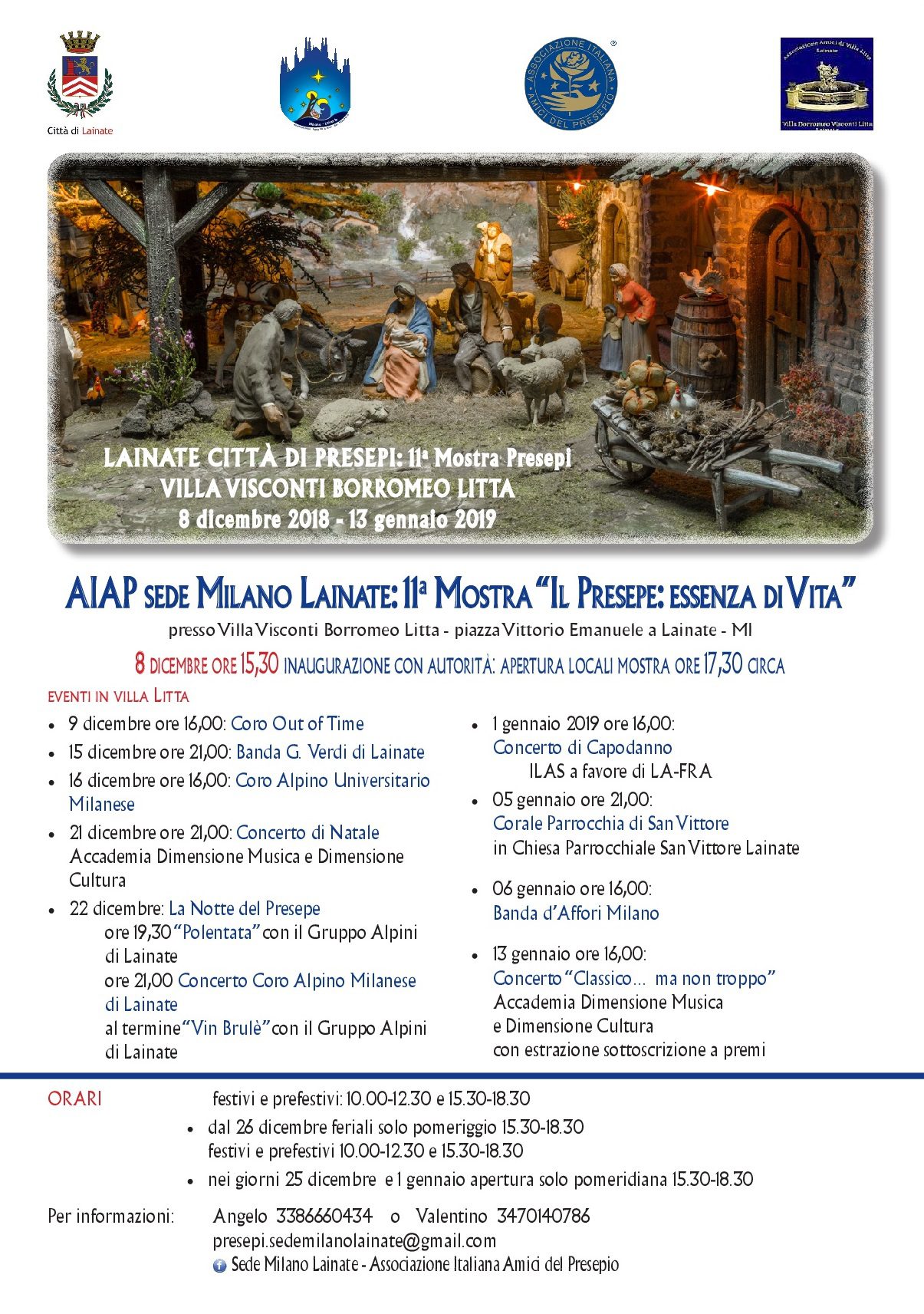 Le sale settecentesche di Villa Visconti Borromeo Litta di Lainate (Milano) ospitano l’undicesima edizione dell’esposizione di presepi a cura dell’Associazione Italiana Amici del Presepio (AIAP – sede Milano Lainate). L’allestimento presenta una cinquantina di presepi provenienti da tutta la Lombardia, in aggiunta a diorami realizzati fuori regione, da Taranto a Vicenza. La mostra si rinnova ogni anno e quest’anno è caratterizzata da una straordinaria ambientazione, arricchita da materiali innovativi come la colorazione fluo, un tocco di ingegneria, workshop per bambini.