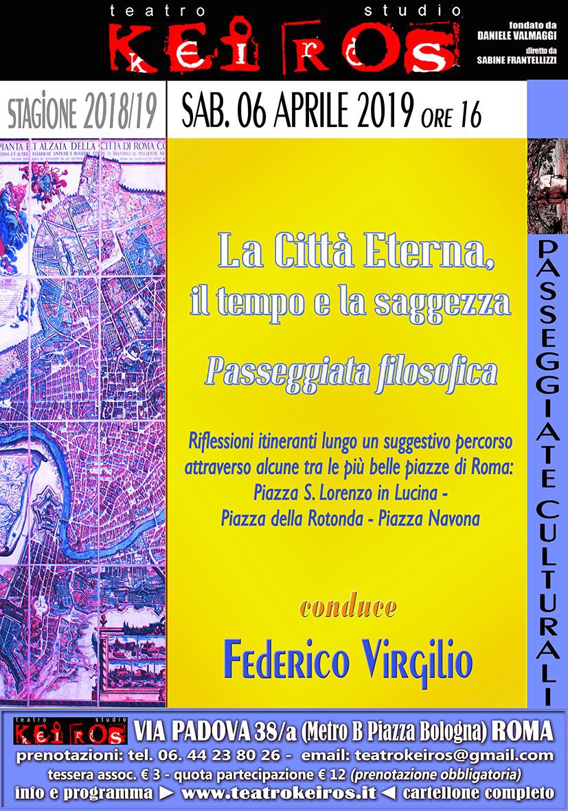 Sabato 6 aprile 2019 a Roma, da piazza di S. Lorenzo in Lucina alle ore 16:00 il consulente filosofico Federico Virgilio, in collaborazione con il teatro Keiros, proporranno la passeggiata filosofica dal tema Il tempo della Saggezza, un’attività di gruppo che con stile filosofico dialogico propone ai partecipanti un argomento su cui ognuno potrà esprimere la propria opinione, esercitando così la propria riflessione, riscoprendo la libertà del pensare nella splendida cornice offerta dalle più belle piazze romane. La passeggiata è un evento aperto a tutti.