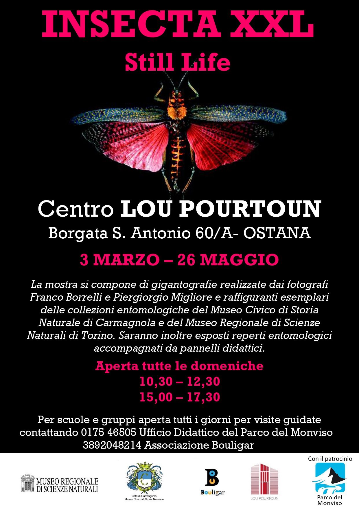 Domenica 3 marzo 2019 presso il Centro Lou Pourtoun di Ostana (Cuneo) inaugura l’allestimento della mostra “Insecta XXL – Still Life”. L’esposizione, curata dall’appassionato entomologo Sergio Rastelli, è stata allestita nel 2007 dal Museo Regionale di Scienze Naturali di Torino e dal Museo Civico di Storia Naturale di Carmagnola per valorizzare le raccolte entomologiche dei due musei e la biodiversità come caratteristica essenziale della natura, individuando negli insetti l’infinito del contrasto, scavalcando pregiudizi e ataviche credenze.