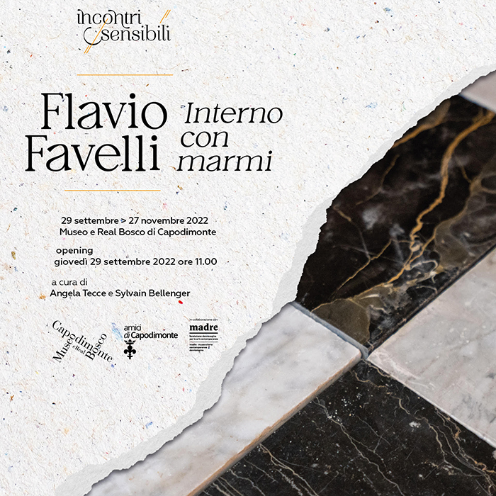 Interno con Marmi è l’opera di Flavio Favelli presentata per il nono appuntamento di “Incontri Sensibili”, le mostre focus del Museo e Real Bosco di Capodimonte che pongono in dialogo gli artisti contemporanei con le collezioni del Museo. L’installazione, a cura di Angela Tecce e Sylvain Bellenger, con la collaborazione di Luciana Berti, è stata ideata in relazione al Ciborio, realizzato tra il 1619 e il 1623, su progetto di Cosimo Fanzago per contenere il Santissimo Sacramento nella chiesa di Santa Patrizia a Napoli. Una vera e propria architettura in miniatura, impreziosita dalla tecnica del commesso marmoreo che imita tralci vegetali, vasi con fiori e uccellini, un monumentale tabernacolo del barocco napoletano in bronzo dorato, rame dorato, marmi policromi e pietre dure.