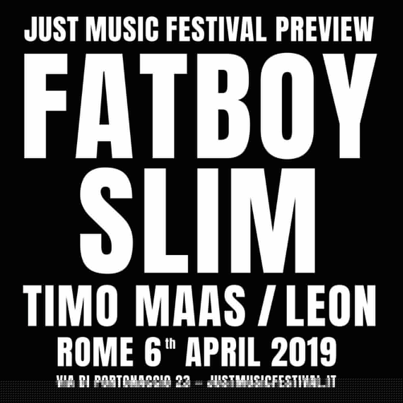 Sabato 6 aprile 2019 torna il Just Music Festival con una preview imperdibile che annuncia l’arrivo dell’edizione 2019, la quinta di uno dei più importanti eventi internazionali di Roma, ogni anno teatro della migliore ricerca sonora e artistica contemporanea. Ad aprire le danze a via di Portonaccio, 23 (ex Animal Social Club), il re del big beat Fatboy Slim, produttore discografico, beatmaker e dj. Insieme a lui, l’ormai leggendario Timo Maas, uno dei personaggi più popolari della scena house attuale e l’italiano Leon, producer che si è esibito nei migliori club di tutto il mondo ed è stato resident del Cocoricò.