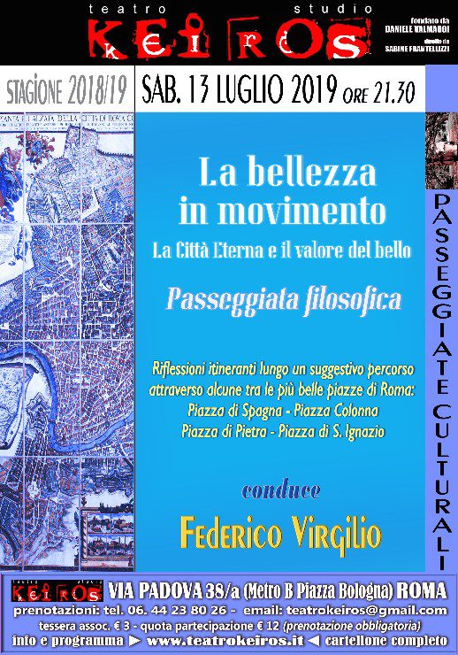Sabato 13 luglio 2019 a Roma il consulente filosofico Federico Virgilio, in collaborazione con il teatro Keiros, propongono la passeggiata filosofica, attività culturale di gruppo che attraverso uno stile filosofico (il dialogo) affronterà il tema della Bellezza. A partire da piazza di Spagna, camminando per le più belle piazze romane ed accompagnati dalla voce dei filosofi, i partecipanti potranno fare esperienza viva della filosofia, perché saranno loro stessi ad essere protagonisti, con le loro idee: che cos’è la Bellezza, per me? La passeggiata è aperta a tutti. Unico requisito: la curiosità.