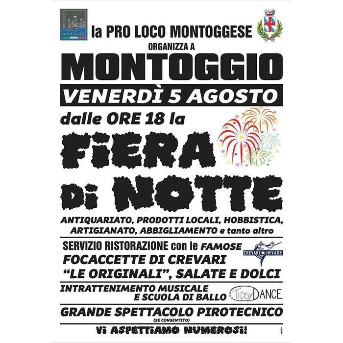 Antiquariato, prodotti locali, hobbistica, artigianato, abbigliamento e tanto tanto altro. La Fiera di Notte di Montoggio vi aspetta con anche le famose focaccette di Crevari, intrattenimento musicale e un grande spettacolo pirotecnico.