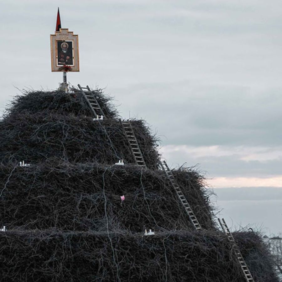 Vero e proprio monumento d’arte e artigianalità contadina, unico per dimensioni – 20 metri di altezza per 20 di diametro – e perché interamente in legno naturale, con oltre 30mila fascine di tralci di vite (sarmenti) abilmente poste una sull’altra, ogni anno, da oltre trecento, cresce, brucia e svanisce, diventando cenere, simbolo di rigenerazione.