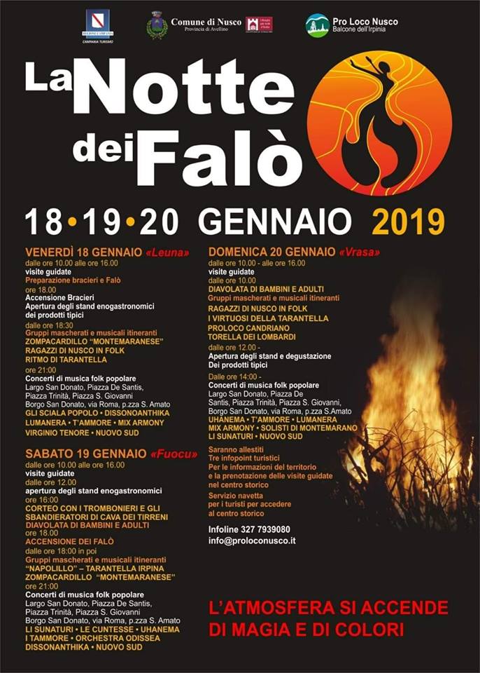 Dal 18 al 20 gennaio 2019 la città di Nusco (Avellino), come da tradizione, ospiterà un rito importante fatto di storia e modernità. Si tratta di una delle feste più antiche dell’Irpinia il cui programma è caratterizzato da spettacoli folkloristici, gastronomia tipica e musica popolare. Nelle ultime edizioni la manifestazione ha registrato un’alta percentuale di affluenza turistica, infatti sono state circa 15.000 i visitatori che hanno condiviso la gioia di questo evento che oramai da quattro secoli, con l’accensione dei fuochi, unisce credenze sacre ed aspetti profani di origini medievali.