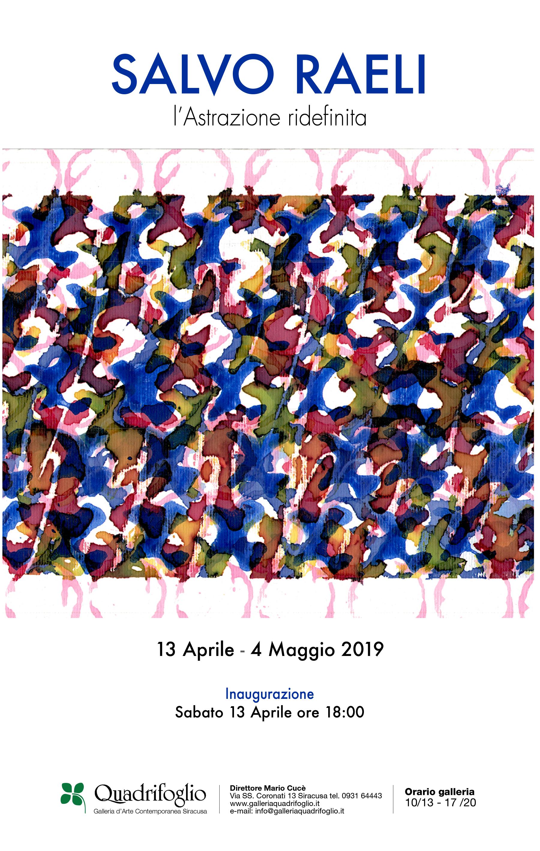 Dal 13 aprile al 4 maggio 2019 la Galleria Quadrifoglio di Siracusa proporrà una personale di Salvo Raeli dal titolo L’Astrazione Ridefinita, una raccolta di 15 opere realizzate su cartone con tecniche miste, a cura di Mario Cucè con testo critico di Demetrio Paparoni. L’espressione Astrazione Ridefinita è stata coniata dal critico d’arte Demetrio Paparoni per indicare le nuove forme di astrazione sviluppatesi negli anni Novanta un pò ovunque, soprattutto negli Stati Uniti e a New York in particolare. Gli artisti ascrivibili a questa corrente non vedevano l’astrazione come antitesi della figurazione ma come una sua variante. I loro dipinti astratti potevano leggersi anche in chiave figurativa, per esempio come paesaggi interiori, come quelli di Raeli, griglie costruite con virgole di colore. L’artista utilizza colori dalla diversa consistenza, acrilici, pastelli e acquerelli in modo che la loro sovrapposizione non copra ma lasci trasparire le pennellate sottostanti. Le variazioni di dosaggio e le sovrapposizioni conferiscono alle opere una gamma molto ampia di colori e tonalità.