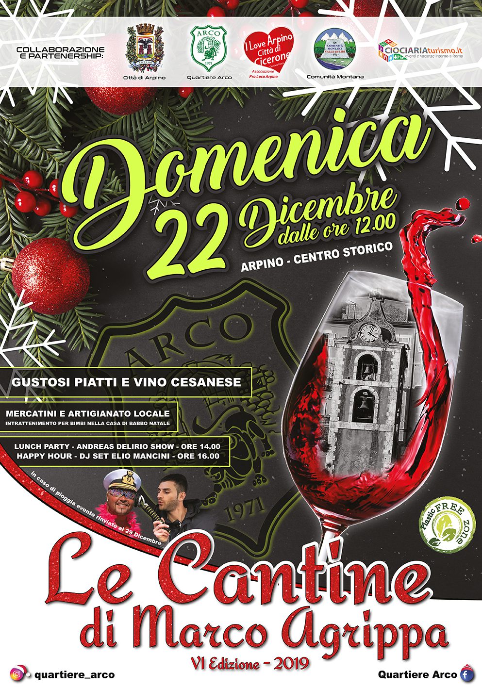 Ad Arpino (Frosinone) nella giornata di domenica 22 dicembre 2019 torna il grande appuntamento con la 6° edizione del Le Cantine di Marco Agrippa. Dalle ore 12:00 lungo via Marco Agrippa e nel centro storico della città di Cicerone si alterneranno gustosi piatti, vino, mercatini di artigianato e prodotti tipici, spettacoli e tanto divertimento. Per i più piccini non mancheranno animazioni e la Casa di Babbo Natale. Spazio anche alla musica con Andreas Delrio Show + Elio Dj.
