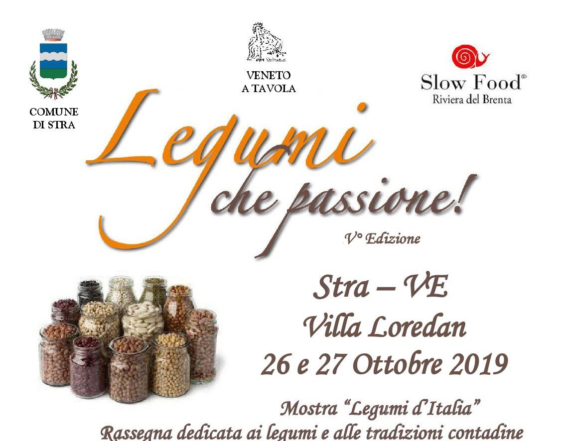 La manifestazione Legumi che Passione, giunta alla 5° edizione, si terrà a Stra, nella Riviera del Brenta, a Villa Loredan (Venezia), sabato 26 e domenica 27 ottobre 2019. Promossa dal Comune di Stra e organizzata da Veneto a Tavola, in collaborazione con la Condotta Slow Food Riviera del Brenta. Da sabato 26, in Villa Loredan, sarà allestita la grande mostra Legumi che Passione, con oltre 350 varietà di legumi di ogni territorio italiano, alcune antiche e rare, con tutti i Presidi Slow Food, e la possibilità, per gli appassionati, anche di ricevere o scambiare alcuni semi per provare a coltivarli nel proprio orto.