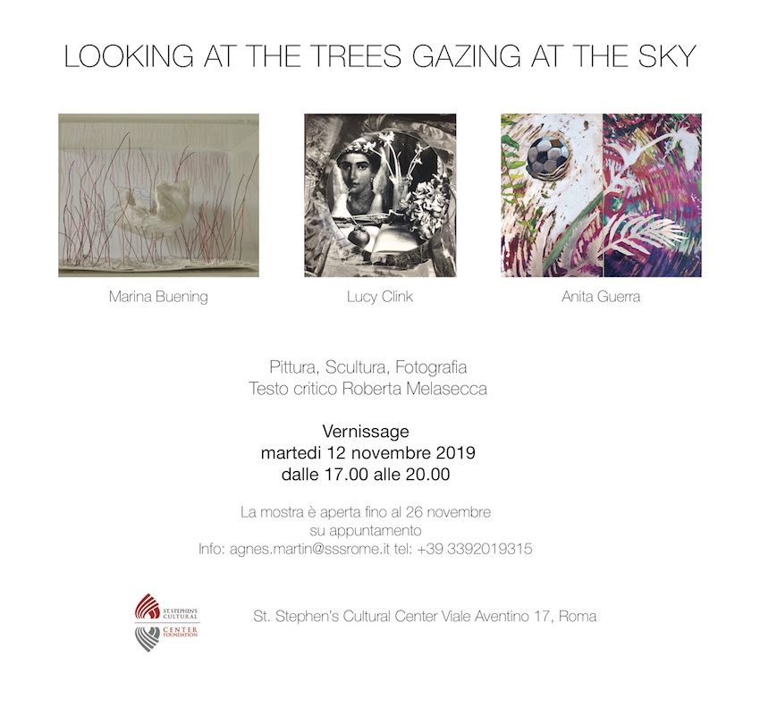 Il giorno 12 novembre 2019 alle ore 17:00 il St Stephen’s Cultural Center di Roma presenta la mostra Looking At The Trees Gazing At The Sky: un dialogo tra le poetiche di Marina Buening, Lucy Clink, Anita Guerra accompagnato da un testo critico di Roberta Melasecca. Le tre artiste si confrontano sulla natura e sul naturale, evidenziandone aspetti quali la fragilità, la conservazione, la trascendenza, la realtà e l’illusione in un susseguirsi di dimensioni intimistiche che sorvolano passato e presente. Marina Buening realizzerà una mini installazione di scatole trasparenti che prendono forma da strane conchiglie e dietro di esse dei disegni realizzati a matita e delle acqueforti a punta secca. Lucy Clink presenterà una serie di fotografie in bianco e nero e stampe in gelatina d’argento ispirate agli elementi tipici della tradizione pittorica quali la natura morta, il paesaggio e il ritratto. Anita Guerra mostrerà un mondo di paesaggi naturali, reali ed illusori, presentando un olio su rame.