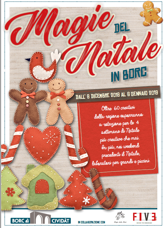 Dall’8 dicembre al 6 gennaio 2019, nel vivace scenario del centro commerciale Borc di Cividât di Cividale del Friuli (Udine), oltre 60 creativi della regione esporranno a rotazione per le quattro settimane di Natale più creative che mai. In più nei weekend precedenti il Natale laboratori per grandi e piccini.