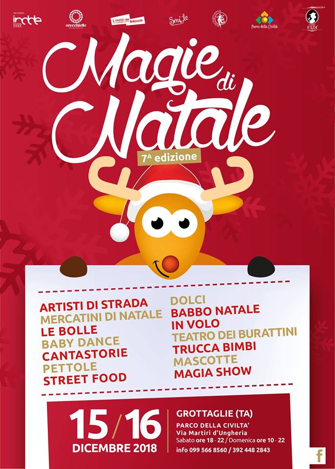 Il 15 e 16 dicembre Grottaglie (Taranto) ospiterà la settima edizione dell’evento Magie di Natale. Nella suggestiva cornice del Parco della Civiltà, tra arte di strada, mascotte, pettole e caldarroste, il clima natalizio animerà la bella cittadina pugliese con i magici Mercatini di Natale. Il programma, oltre alle bancarelle di artigianato, comprende postazioni di street food e tante attrazioni come Babbo Natale in volo, baby dance, trucca bimbi e molto altro ancora.