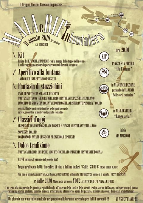 Domenica 11 agosto 2019 in provincia di Bergamo si svolgerà la 10° edizione di MAIAeBIFinFONTALERA, cena alla riscoperta dei prodotti e piatti locali all’interno delle corti e delle vie del centro storico di Bossico: un’esperienza di buona cucina fra storia, profumi, sapori e musica arricchita da atmosfere e suoni del passato insieme a racconti dei prodotti tipici. A seguire in piazza Cavour musica live dalle ore 21:30 e chiosco bar aperto a tutti.