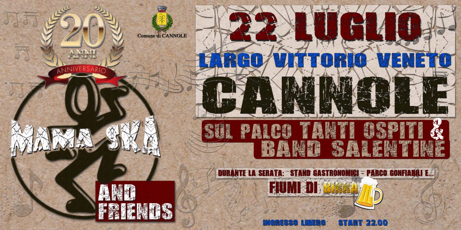 Mama Ska & Friends – in programma a Cannole (Lecce) il 22 luglio 2019– è un concerto/festa all’interno del quale i Mama-Ska ripercorreranno quasi 20 anni di attività artistica. La band per l’ occasione ha chiamato a raccolta tanti grandi ospiti del panorama musicale salentino: oltre all’esibizione live del gruppo saranno disponibili gonfiabili, stand gastronomici e un dj-set a fine concerto. Nata nel Salento sugli sgoccioli del 1998 tra i banchi di scuola, la formazione è composta da 5 musicisti con un progetto curato nei minimi dettagli. Nell’estate del 1999 i Mama-Ska vincono “Onderock Festival” proponendosi in diverse piazze e manifestazioni coinvolgendo sempre più un numero maggiore di curiosi e riuscendo a portare il loro “Rocksteady Beat” dappertutto. Molti definiscono il gruppo una vera e propria “Macchina da Palco” e forse proprio la loro instancabile voglia di suonare dal vivo è una delle cause del ritardo di una produzione discografica.
