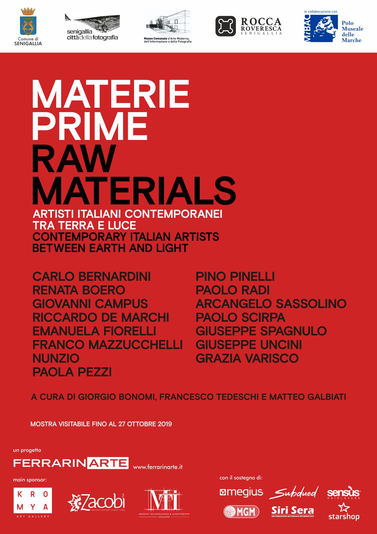 Dal 6 settembre al 27 ottobre 2019 la storica sede della Rocca Roveresca di Senigallia (Ancona) ospiterà la mostra Materie Prime. Artisti Italiani Contemporanei tra Terra e Luce a cura di Giorgio Bonomi, Francesco Tedeschi e Matteo Galbiati. Promossa dal Comune di Senigallia in collaborazione con il Polo Museale delle Marche, l’esposizione presenta una settantina di opere realizzate da Carlo Bernardini, Renata Boero, Giovanni Campus, Riccardo De Marchi, Emanuela Fiorelli, Franco Mazzucchelli, Nunzio, Paola Pezzi, Pino Pinelli, Paolo Radi, Arcangelo Sassolino, Paolo Scirpa, Giuseppe Spagnulo, Giuseppe Uncini e Grazia Varisco: artisti appartenenti a diverse generazioni, ma tutti con curricula di altissimo livello, accomunati dal lavoro condotto con e sulla materia. L’arte visiva dalle Avanguardie storiche ad oggi, accanto ai materiali tradizionali quali la tela, la tavola, l’olio, il marmo, il bronzo e il gesso si è servita di materie tra le più diverse ed anomale – dagli scarti agli oggetti comuni, dal carbone agli strumenti elettrici, dagli stracci ai vetri e così via – tanto che possiamo affermare, da Duchamp in poi, che ogni “materia” può essere funzionale alla creazione dell’opera d’arte.