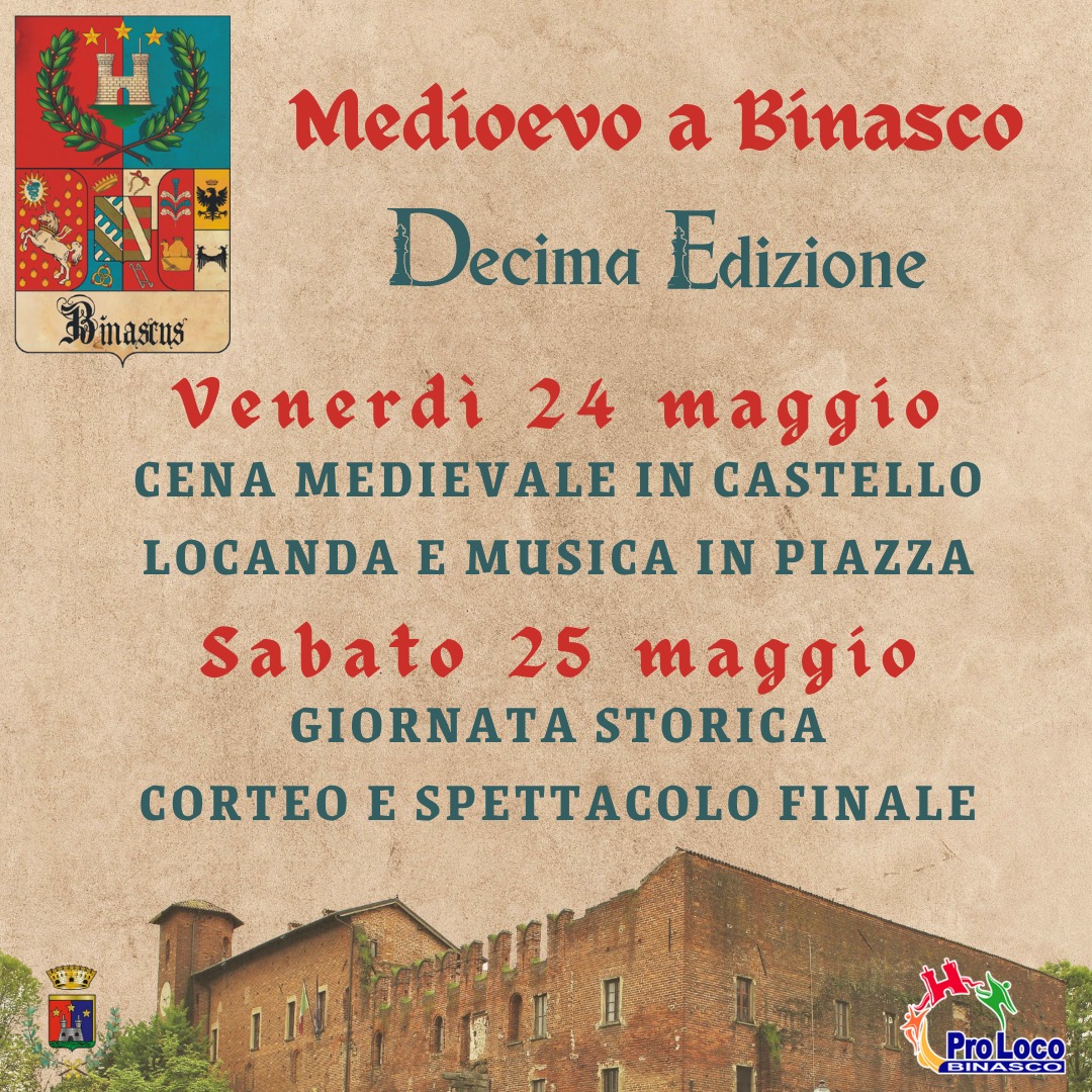 Ascoltate, genti d’ogni contrada! Il tempo si piega, il passato torna! Il 24 e 25 maggio, Binasco si veste d’armi e corone per celebrare il Medioevo per la decima volta, con festa e baldoria! Cavalieri audaci, dame gentili, banchetti degni dei Visconti! Non mancate, o vi perderete la gloria!