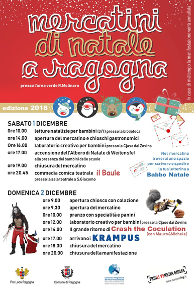 Oltre 60 espositori, che offriranno le tipicità natalizie (addobbi, decorazioni…), le specialità culinarie e artigianali per tante idee regalo da scegliere, in una passeggiata rilassante e all’insegna del clima natalizio. I Mercatini saranno animati da una serie di attività culturali ed enogastronomiche adatte ad ogni visitatore (laboratori per bambini, teatro, spettacoli comici e la partecipazione dei Krampus di Fusine). Una serie di ingredienti che, grazie all’impegno di tutti, sono la base per un ulteriore successo dell’immagine di Ragogna a livello locale e regionale, un luogo che sta diventando sempre più una destinazione da visitare e conoscere per le sue bellezze naturalistiche e culturali. In abbinata ai Mercatini, la Pro Loco ha predisposto la “Lotteria di Natale” (primo premio: un viaggio benessere di due notti per due persone, a seguire altri 14), la cui estrazione si svolgerà venerdì 14 dicembre alle 18:00 presso il chiosco del Parco R. Molinaro. I biglietti si potranno acquistare in Pro Loco, durante i mercatini stessi o dagli aderenti all’iniziativa.