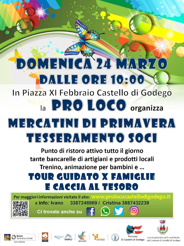 In provincia di Treviso il primo appuntamento dell’anno con la Pro Loco di Castello di Godego quest’anno si terrà domenica 24 marzo in piazza XI Febbraio con l’edizione 2019 dei Mercatini di Primavera. A fare da contorno all’evento ci saranno ottimi prodotti per tutti i gusti e tante bancarelle di espositori di artigianato, alimentari e florovivaisti che con le loro creazioni daranno colore alla giornata. Per tutta la giornata sarà attivo il punto di ristoro della Pro Loco con panini, bibite, patatine e vin brulè e si potrà effettuare il tesseramento come Soci dell’Associazione.