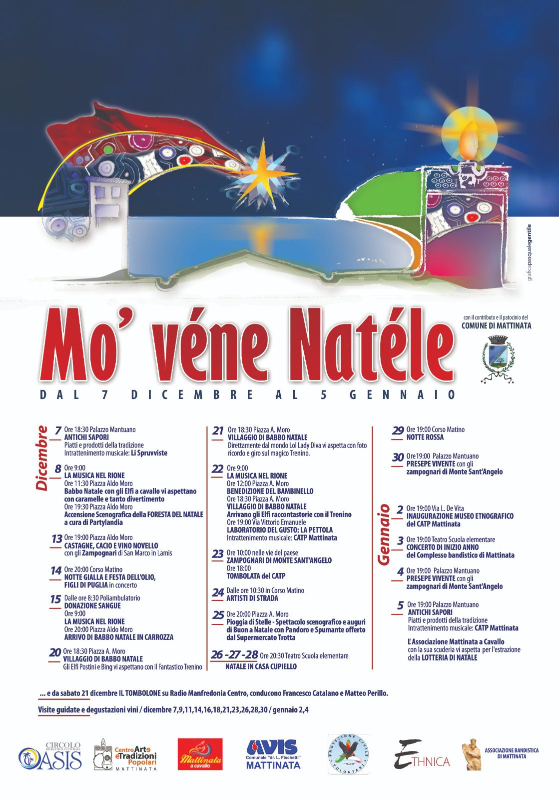 La farfalla bianca del Gargano dal 7 dicembre 2019 al 5 gennaio 2020 ospiterà Mo’Véne Natéle, la programmazione natalizia degli eventi a Mattinata (Foggia) ideata dal Circolo Ricreativo Culturale Oasis, il Centro Arte e Tradizioni Popolari, l’Associazione Mattinata a Cavallo e altre realtà associative. Il cartellone è stato realizzato grazie al patrocinio e con il contributo del Comune di Mattinata e delle attività commerciali. La kermesse offrirà a cittadini e turisti un calendario ricco di iniziative in un’atmosfera suggestiva tra luci, decori e sapori: un’esperienza unica, culturale e divertente, per tutta la famiglia! Il programma valorizzerà le tradizioni del territorio e gli aspetti caratteristici del paese con spettacoli di musica popolare e gli immancabili zampognari che allieteranno le degustazioni e la promozione dei piatti tipici curata dall’Associazione Mattinata a Cavallo. Come ogni anno le domeniche di dicembre saranno allietate dalle note del complesso bandistico di Mattinata. Non mancherà il Villaggio di Babbo Natale e gli auguri in piazza del 25 dicembre e la novità del presepe vivente che si svolgerà nel centro storico. Al giallo e al rosso saranno dedicate due notti: il 14 dicembre si svolgerà la Notte Gialla per celebrare con un momento di festa l’olio extra vergine d’oliva mentre il 29 dicembre l’appuntamento sarà con la Notte Rossa durante la quale musica, artisti di strada e degustazioni animeranno il centro del paese. Non mancherà la tradizione del teatro con l’Associazione ETNICA in Natale a Casa Cupiello.