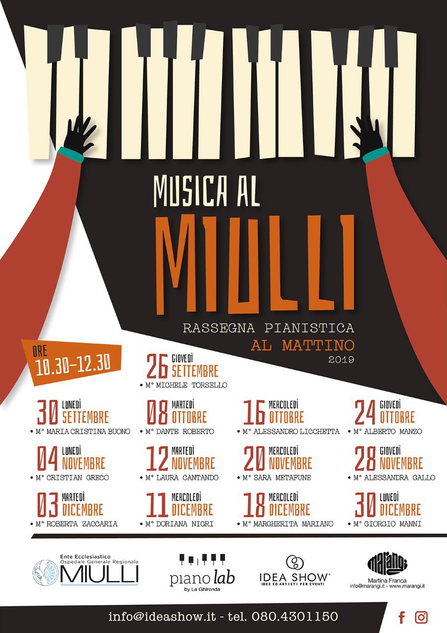 L’Ospedale Miulli di Acquaviva delle Fonti (Bari) apre le porte alla musica e organizza una serie di concerti dedicati alla composizione classica, che si terranno negli spazi destinati all’attesa degli utenti dal 26 settembre al 30 dicembre 2019. Protagonista delle esibizioni dal vivo sarà dunque il pianoforte verticale T. Trauhverin Berlino, costruito intorno al 1917 e restaurato di recente per essere messo a disposizione di vuole suonarlo per sé e per gli altri. Due appuntamenti per giornata, alle 10:30 e alle 12:30, e tanti professionisti del pianoforte, che si alterneranno alla tastiera con dinamismo, passione e virtuosismo. Una rassegna per rasserenare lo spirito e restare affascinati dalle straordinarie composizioni dei maestri dell’ambito classico.