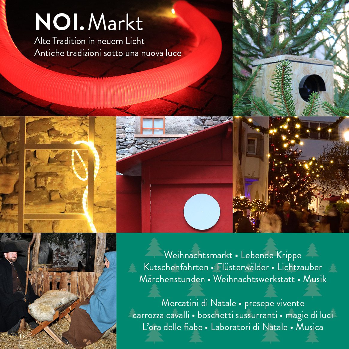 Dal 14 al 23 dicembre, il centro di Egna (Bolzano) sarà rivitalizzato da una speciale campagna natalizia con magie di luce, mercatini di Natale, carrozze trainate da cavalli, boschetti sussurranti, presepe vivente, laboratorio di Natale, l’Ora delle Fiabe, pista di pattinaggio, musica e molto altro. Neumarkt Egna Marketing in collaborazione con l’Arch. Manfred Eccli ha sviluppato un piccolo e innovativo concetto che stimola più sensi contemporaneamente e combina il vecchio con il nuovo in modo entusiasmante. L’intero concetto è caratterizzato da “incontro e connessione“, i due termini che sono al centro di questa campagna natalizia. Un Natale per ammirare, ascoltare, osservare, sperimentare e incontrare.