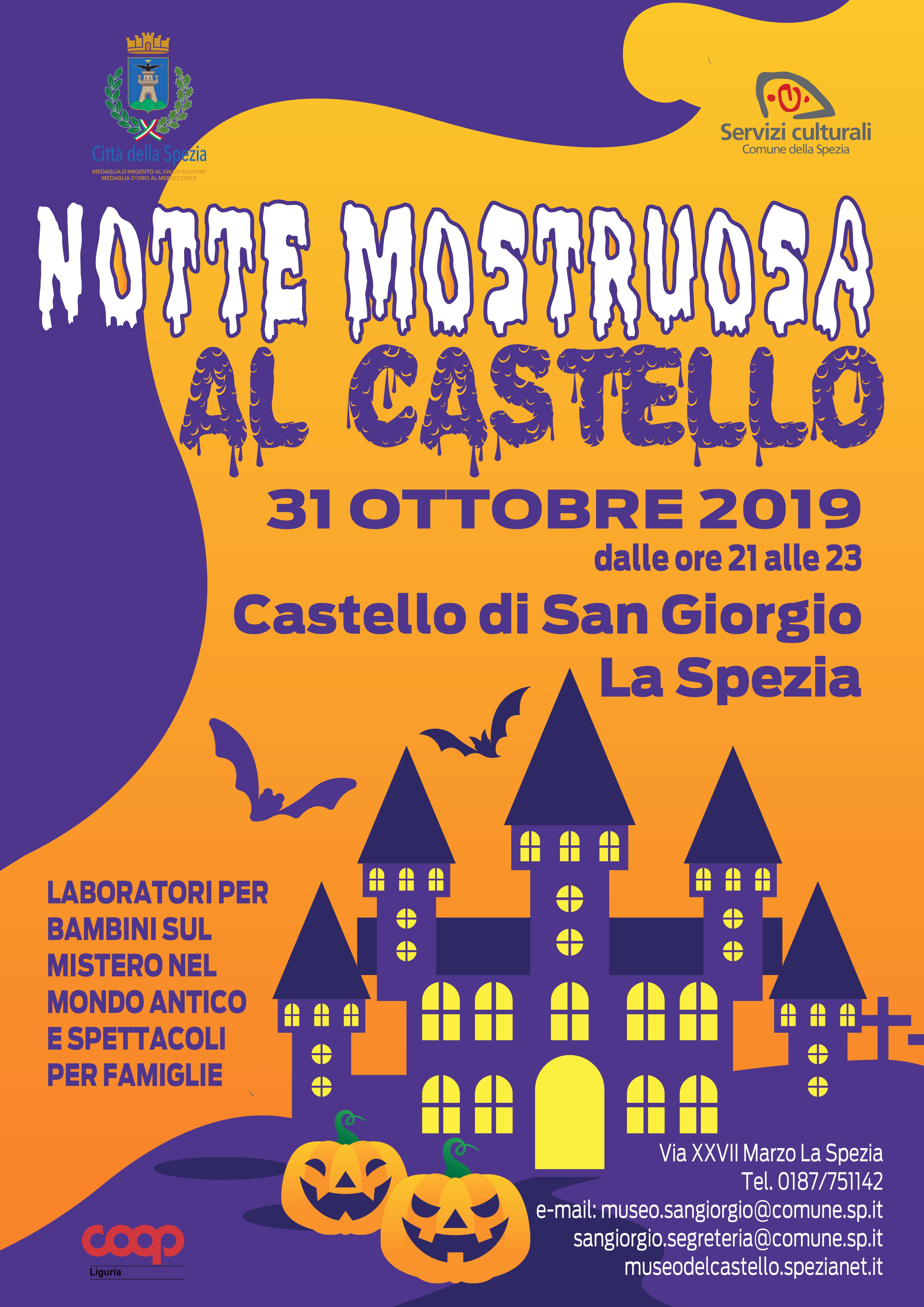 Giovedì 31 ottobre 2019, dalle ore 21:00 alle 23:00, si terrà una Notte Mostruosa al Castello con laboratori e spettacoli per bambini e adulti nelle tenebrose stanze del Castello di San Giorgio a La Spezia. Dalle ore 20:00 alle 24:00 del 31 ottobre 2019 sarà disponibile un servizio di bus navetta gratuito da e per piazza Verdi verso il Museo del Castello.