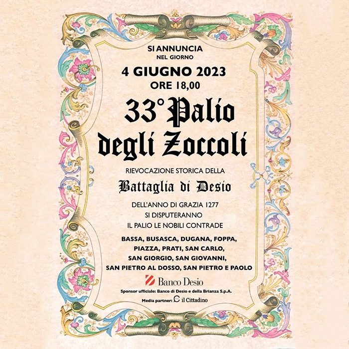 Il Palio degli Zoccoli di Desio, voluto per promuovere e realizzare la rievocazione storica della battaglia di Desio (21 gennaio 1277), nasce nel 1989. Esso si propone quale evento in grado di sollecitare, riscoprire e salvaguardare le origini e le identità culturali della città.