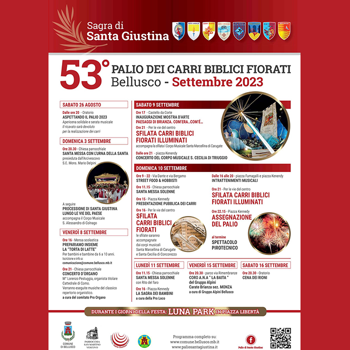L’omaggio più bello che la popolazione di Bellusco ha voluto rendere alla sua patrona è stato il Palio di S. Giustina. Questa singolare manifestazione (che si svolgeva la prima domenica di settembre e dal 1968 la seconda domenica dello stesso mese) aveva il suo culmine nella sfilata dei carri fiorati, che rappresentavano allegoricamente fatti religiosi o biblici. Nato per iniziativa di un gruppo di giovani parrocchiani, il Palio di S. Giustina vide la luce nel 1955 e si svolse ogni anno fino al 1973, salvo l’interruzione del 1966. Espressione di un generoso impegno collettivo e di un genuino sentimento religioso, il Palio si manifestava a livello di rione. I giovani delle contrade, in cui era suddiviso il paese, per settimane si dedicavano nelle ore libere del giorno e della sera ad allestire il proprio carro.