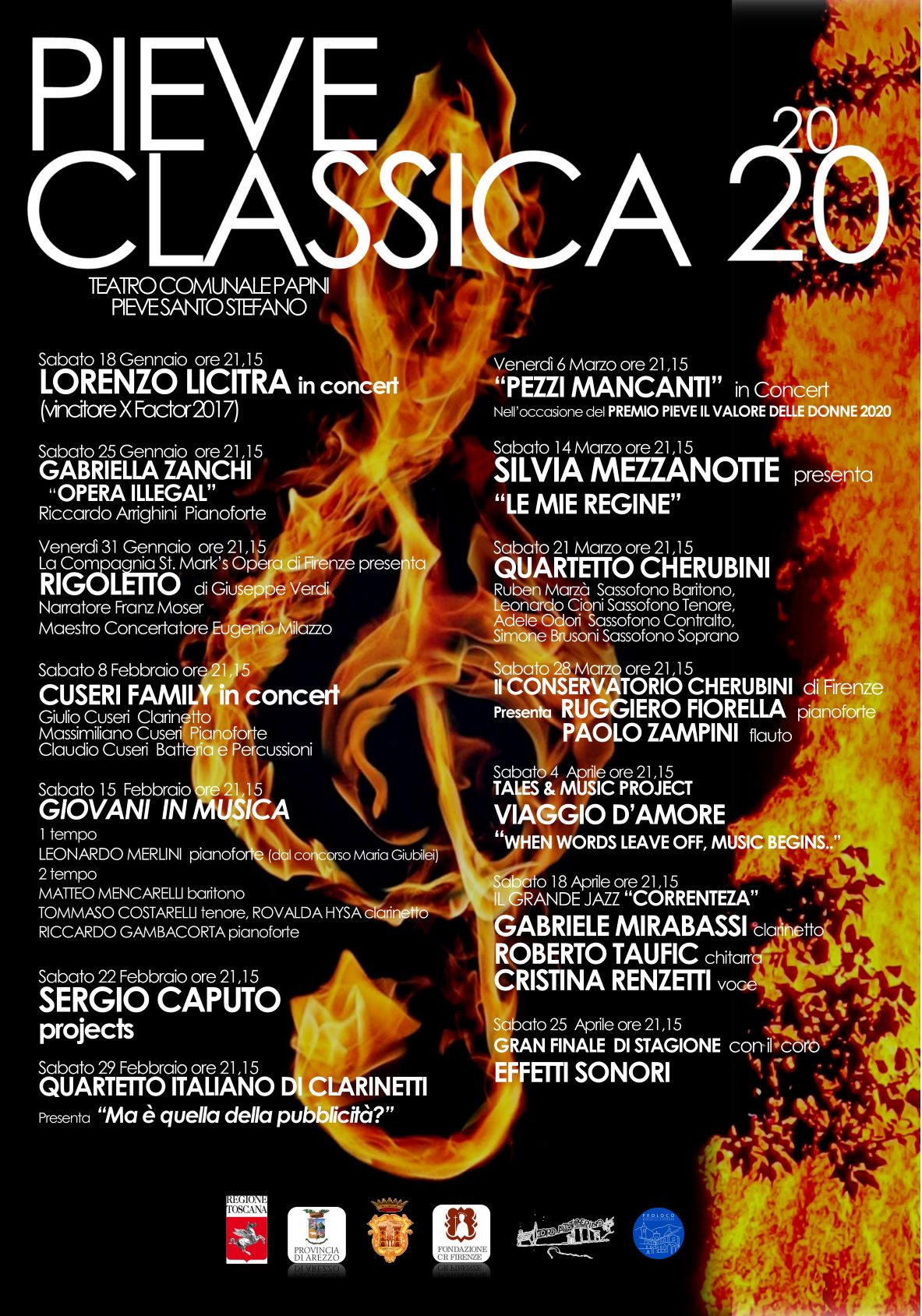 Gli ospiti in questa 6° edizione andranno da Lorenzo Licitra (sabato 18 gennaio), vincitore di XFactor 2017 a Silvia Mezzanotte (sabato 14 marzo), nota voce dei Matia Bazar passando per la St Mark’s Opera Florence che metterà in scena Rigoletto di Giuseppe Verdi (venerdì 31 gennaio), Sergio Caputo trio (sabato 22 febbraio), Gabriele Mirabassi – noto clarinettista a livello mondiale con Roberto Taufic alla chitarra e la voce di Cristina Renzetti (sabato 18 aprile). Continua anche la collaborazione con il Conservatorio Cherubini di Firenze che proporrà un giovanissimo pianista già di fama internazionale, giovanissimi cantanti che si esibiranno in arie note delle opere più famose insieme al vincitore del Concorso Pianistico Internazionale Maria Giubilei (sabato 28 marzo), il Quartetto Cherubini (sabato 21 marzo) e tanti altri artisti che si presenteranno sul palcoscenico del Teatro Papini. L’intento di Pieve Classica non si limita solo ed esclusivamente alla musica in tutti i suoi aspetti, ma dà molta importanza al territorio dell’Alta Valle del Tevere.