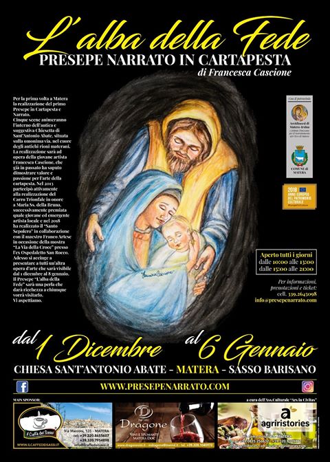 L’opera sarà realizzata dalla giovane artista Francesca Cascione, già nota per la sua collaborazione al Carro Trionfale del 2013 e per la realizzazione del “Santo Sepolcro”, maestosa opera realizzata in ambito della mostra “Le vie della Croce” nell’ex Ospedaletto San Rocco. L’artista presenterà un presepe come non si era mai visto in città: cinque scene in cartapesta saranno l’anima della Chiesa di Sant’Antonio Abate, nel cuore degli antichi rioni materani. L’ “Alba della Fede” appunto, dove la narrazione dei passi biblici illustreranno ogni scena dando loro vita in un contesto fortemente antico e mistico quale quello che emerge dalla bellissima chiesetta. I visitatori sono invitati a visitare l’importante ed imponente opera presepiale, ad ascoltarne i suoni, le parole, a sognare ad occhi aperti di ritrovarsi “All’alba della Fede”.
