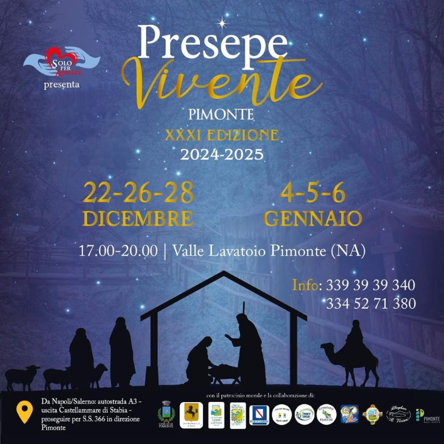 Per questa XXXI edizione il Presepe Vivente di Pimonte offre cinque rappresentazioni, ovvero il 22, 26, 28 dicembre 2024 e il 4-5-6 gennaio 2025, ancora una volta in Valle Lavatoio (località Franche), fra i suggestivi Monti Lattari.