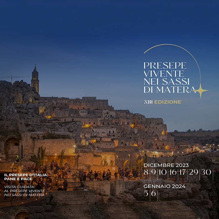 La XIII edizione del Presepe Vivente nei Sassi di Matera quest’anno dal titolo “IL PRESEPE D’ITALIA: PANE E PACE” rivedrà come protagonisti indiscussi i “Sassi di Matera”; l’evento abbraccerà 4 km di percorso partendo dal centro storico attraversando il sasso Barisano ed il sasso caveoso con oltre 200 presenze tra attori professionisti, figuranti, rievocatori storici e compagnie teatrali provenienti da tutta Italia.