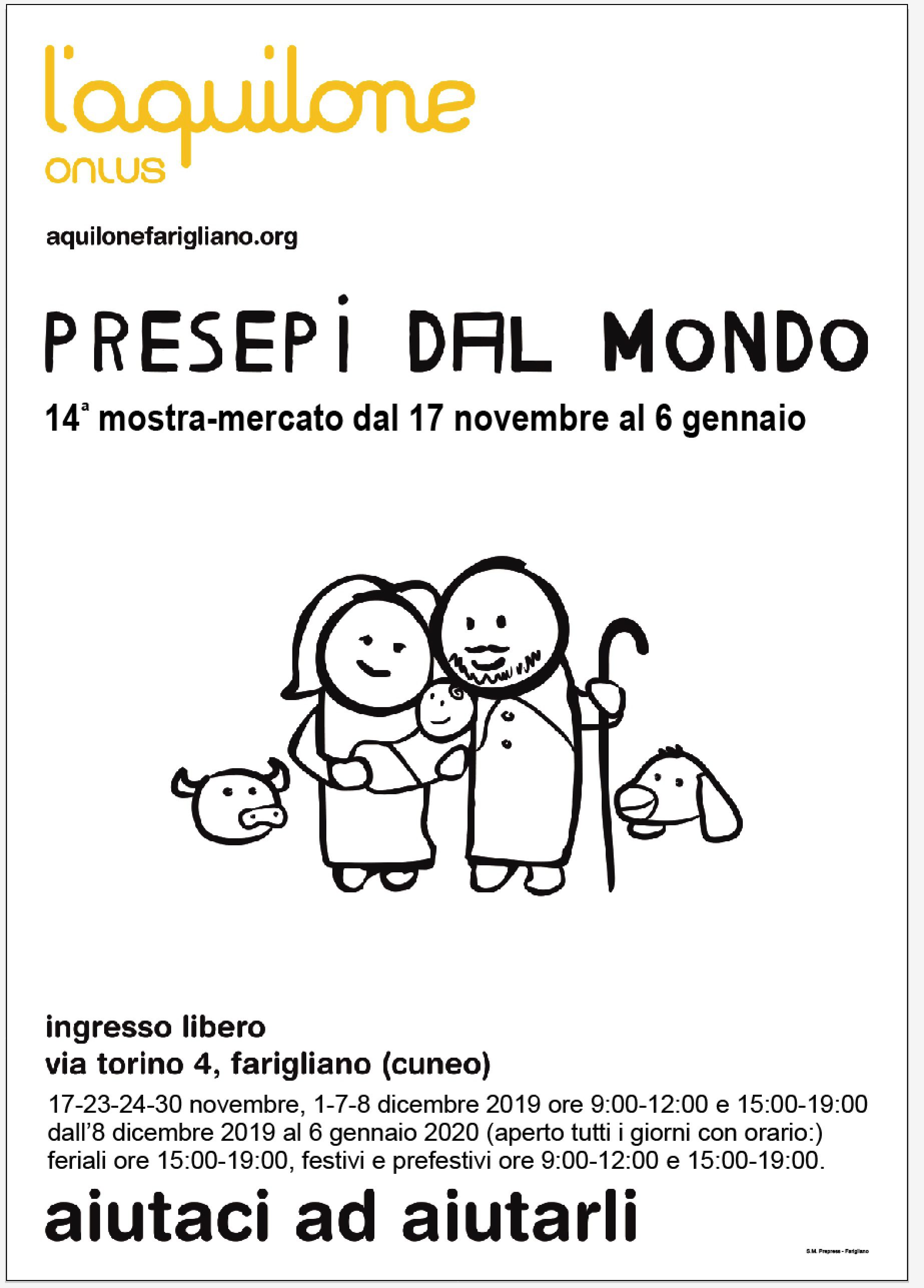 Il Natale si sta avvicinando e nella nostra sede dell’associazione l’Aquilone di Farigliano sita in via Torino, 4 a Farigliano (Cuneo) si inizia a respirare a pieni polmoni l’atmosfera tipica del Natale con l’apertura della Mostra Mercato di Presepi dal Mondo e Mostra presepi d’Autore giunta alla sua 14° edizione. Con un allestimento dei nuovi arrivi, quest’anno si potranno trovare natività provenienti da: Kyrgyzstan, Honduras, Haiti, USA, Guatemala, Thailandia, Indonesia, Turchia, Kenia, Perù , Ecuador, Russia, Ucraina, Mozambico che da domenica 17 novembre 2019 fino al 6 gennaio 2020 sarà possibile semplicemente ammirare o volendo acquisire, dietro contributo minimo, le varie natività provenienti da ogni parte del mondo, presepi della tradizione locale, opere d’autore e sacre rappresentazioni artigianali di ogni dimensione e realizzati con i materiali più disparati, con una sezione dedicata ai carillon e alla palle di neve di ogni foggia e dimensione, che certamente affascineranno e conquisteranno i visitatori e inoltre dalla Repubblica Ceca si potranno trovare gli addobbi dipinti a mano per l’albero di Natale.