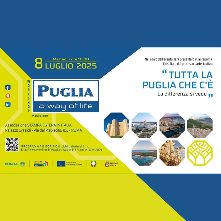 Torna il workshop Puglia, a way of life, con la quinta edizione che si svolgerà il prossimo 𝟴 𝗹𝘂𝗴𝗹𝗶𝗼 𝗮𝗹𝗹𝗲 𝗼𝗿𝗲 𝟭𝟲.𝟬𝟬 𝗮 𝗥𝗼𝗺𝗮 presso l’Associazione della Stampa Estera.