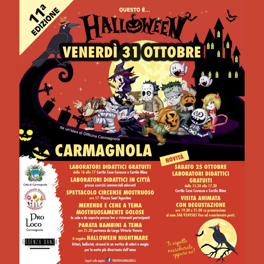 - Venerdì 31 ottobre, con un ricco programma di laboratori, merende paurose e cene mostruose, fino alla tradizionale PARATA IN NOTTURNA e al grande spettacolo conclusivo di danza e teatro “HALLOWEEN NIGHTMARE”.