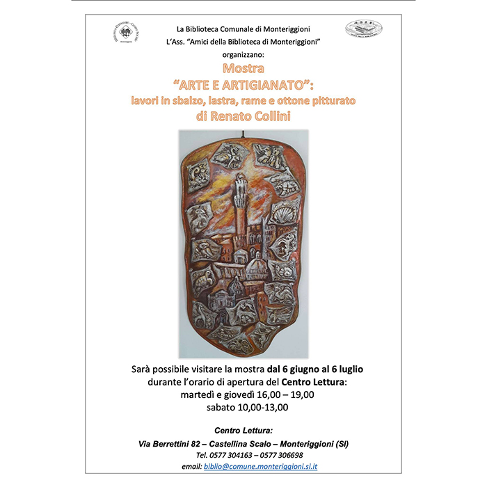 Dal 6 giugno al 6 luglio 2023 sarà possibile visitare presso il Centro Lettura di Castellina Scalo, durante l’orario di apertura, la mostra di Renato Collini “Arte e artigianato: lavori in sbalzo, rame e ottone pitturato”.